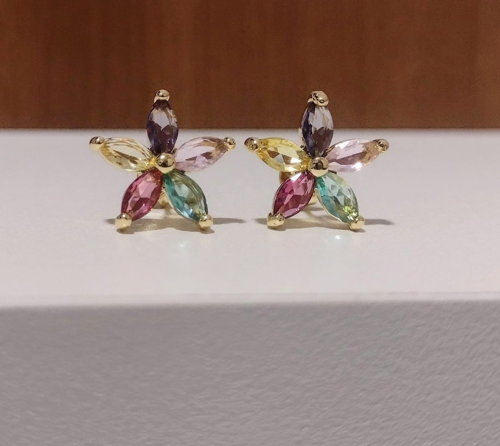 O brinco flor pedras zircônia colorido banhado em Ouro 18 K da Dalumix possui um design lindo e sofisticado, destaca-se pelo o brilho, complementando qualquer estilo com elegância. Perfeito para usar em todas as composições, podendo ser usado também juntamente com outros brincos formando um mix de pura elegância e sofisticação. Venha montar o seu mix na Dalumix! Peças de alto padrão de qualidade, hipoalergênica (sem níquel) garantindo maior durabilidade e brilho as semi joias.