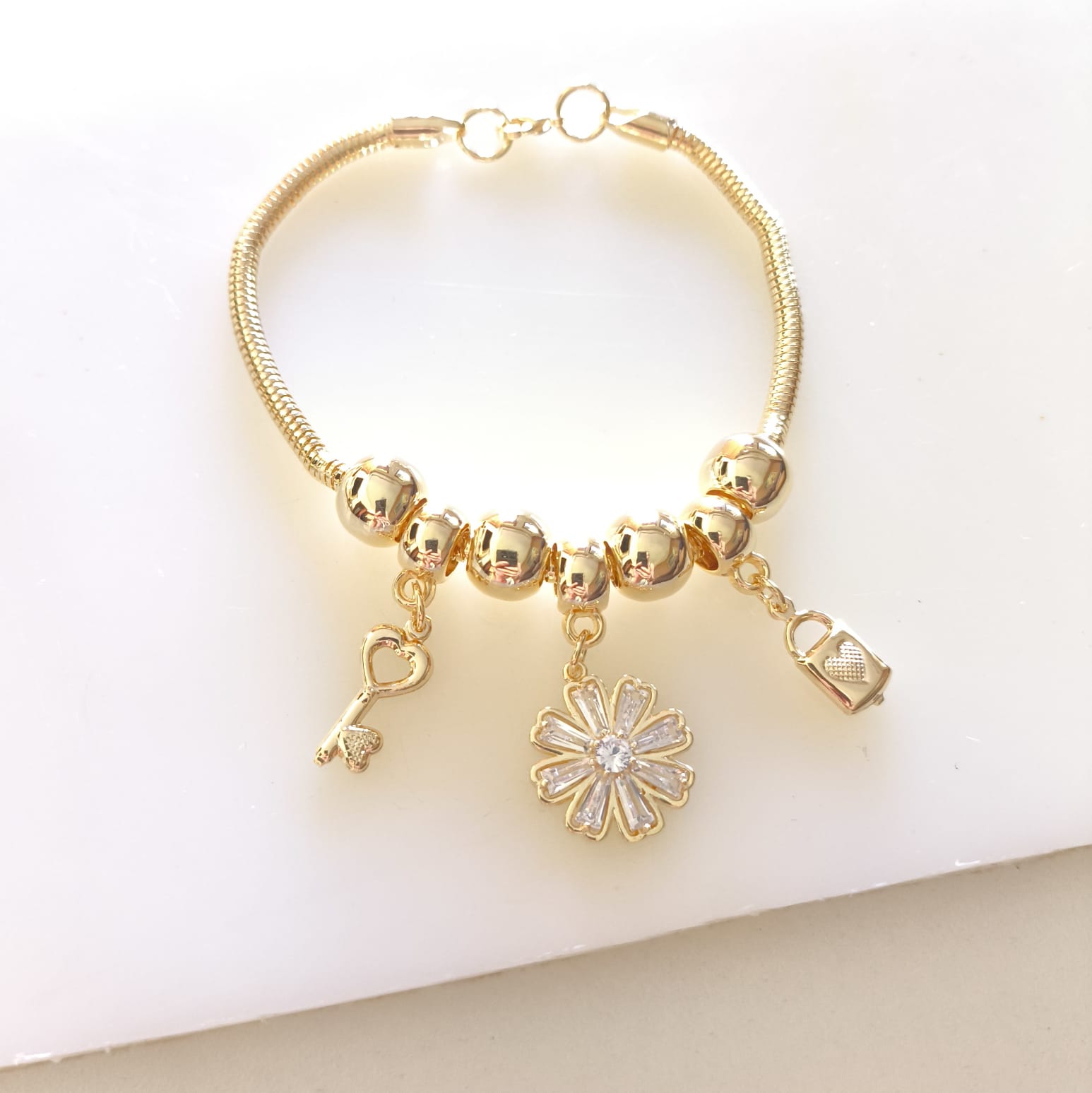 Encante-se com a sofisticação da pulseira berloques chave, cadeado e flor cravejada com pedras Zircônia cristal Banhada a ouro 18 k da Dalumix, uma peça delicada e versátil que combina Charme e elegância. Seus berloques adicionam um toque especial, tornando cada look ainda mais encantador. Ideal para quem busca semijoias finas e exclusivas.